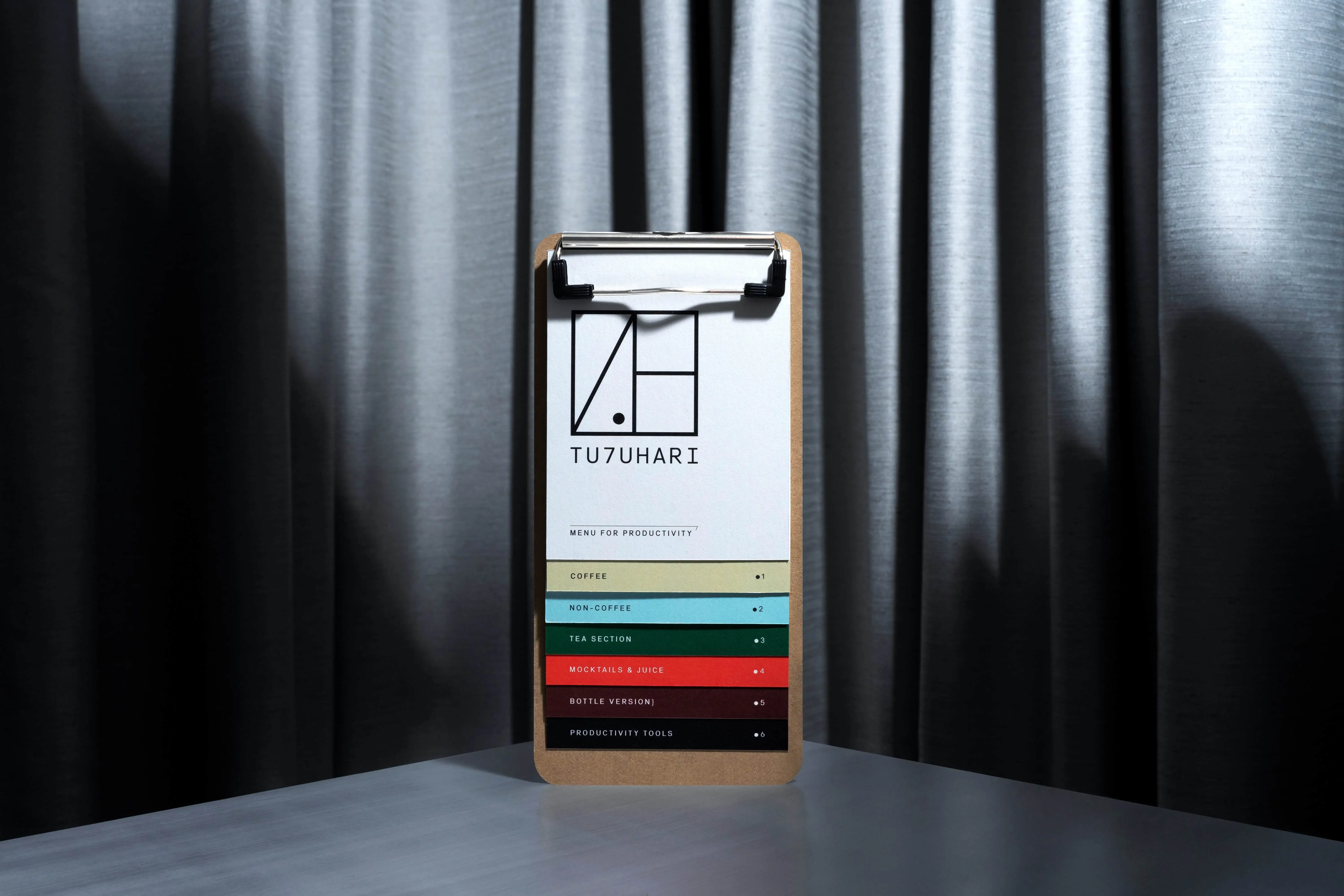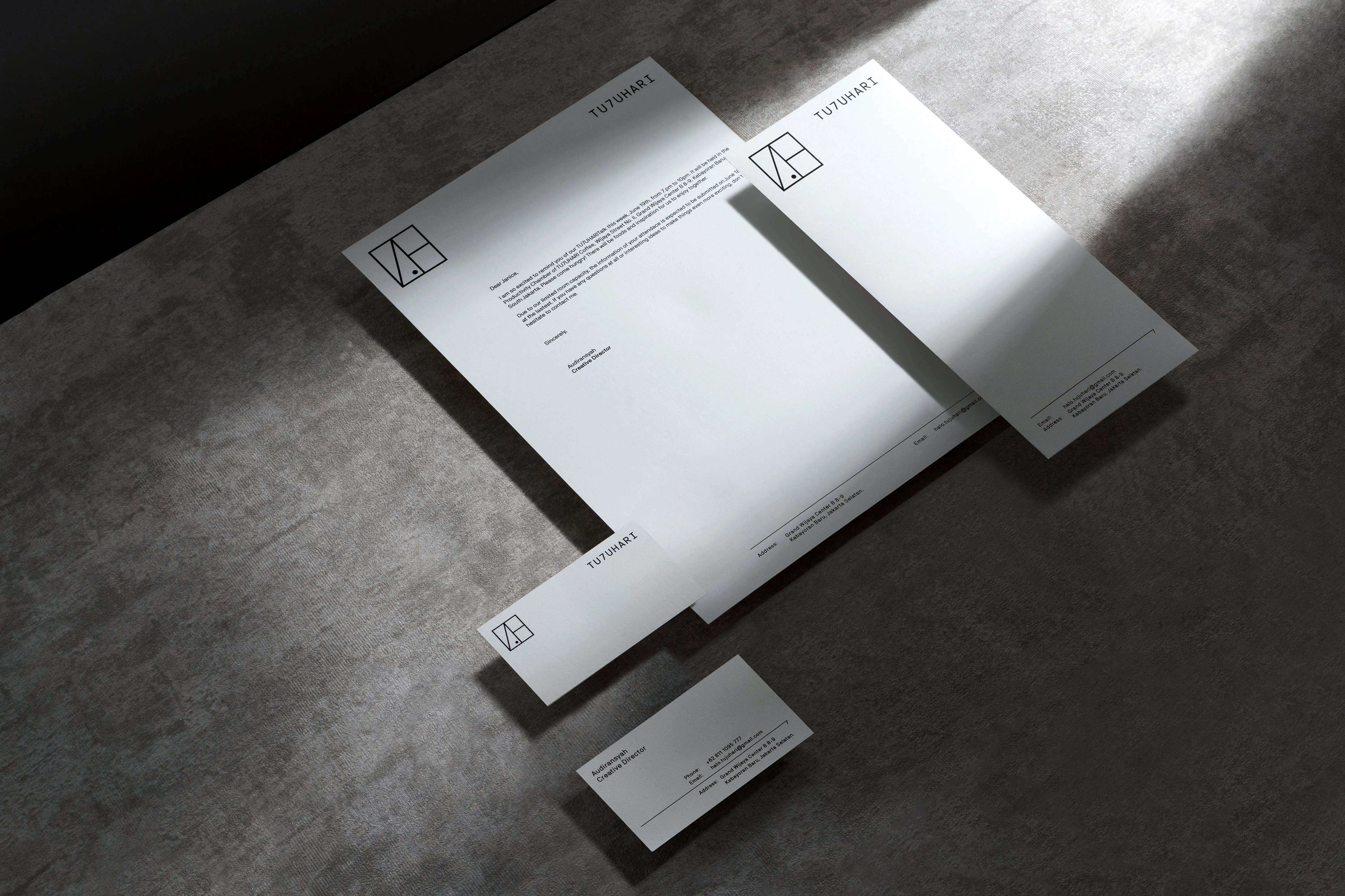 The monogram consists of seven lines for the seven celestials. They might seem scattered at first, but take a closer look and you will notice the ‘7’ ‘H’ inside the arrangement. The dot inside the monogram highlights the role of TU7UHARI for its segment, as the new favorite meeting point for their productivity. We also infused the subliminal 7 on the logotype by altering ‘J’ with ‘7’, using a delicate yet modern monospace typeface—which in turn elevates the modern, clean, and minimalist look of its brand mark.